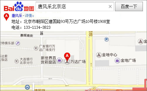 唐風(fēng)采北京店座落于國貿(mào)東邊CBD集中點,東三環(huán)邊,北京電視臺北邊,大望橋西北角的萬達(dá)廣場,地鐵1號線大望路D口出,停車場萬達(dá)廣場東區(qū)停車場,萬達(dá)廣場10號樓1908室。