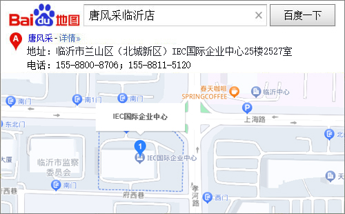 唐風(fēng)采臨沂店位于蘭山區(qū)(北城新區(qū))上海路與孝河路交叉路口西南側(cè)IEC國際企業(yè)中心25樓2527室。周邊商業(yè)繁華,交通非常方便。